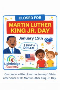 - January 19, 2026 – Center Closed – Dr. Martin Luther King Jr. Day