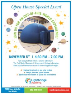 Get ready to blast off on a cosmic adventure! The Fort Worth Museum of Science and History is bringing their mobile Noble Planetarium to Lightbridge Academy of Fort Worth! Space is limited so come early. (Event runs from 4:30pm-8pm but the planetarium will end at 7:30pm)